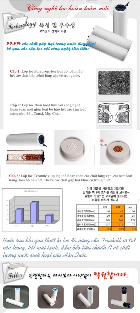 Với công nghệ vô cùng tiên tiến của Dewbell Korea đã được kiểm định bởi các tổ chức uy tín quốc tế. Lõi lọc Nano do Dewbell chế tạo đáp ứng được các yêu cầu khắt khe về tiêu chuẩn nước sạch như: vẫn giữ được những khoáng chất có lợi trong nước đồng thời loại bỏ được hoàn toàn vi khuẩn và các chất độc hại có trong nước.